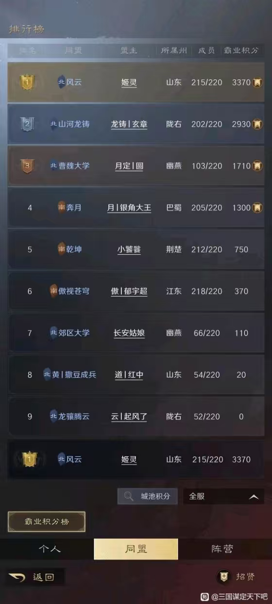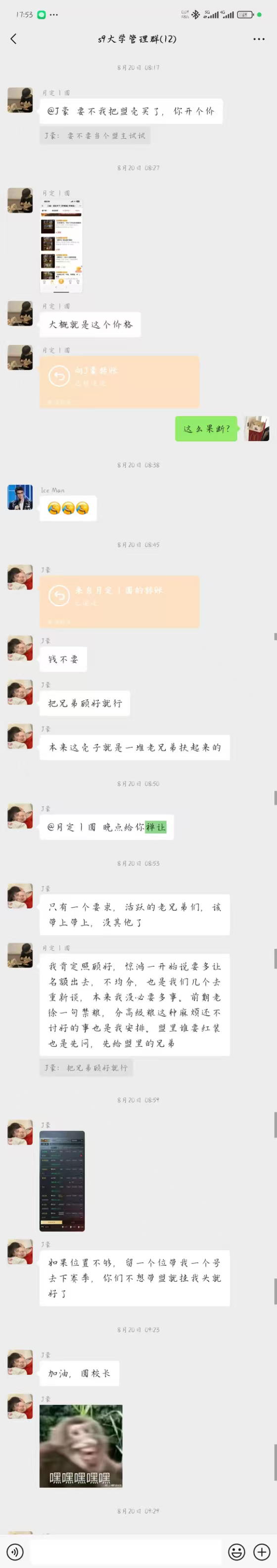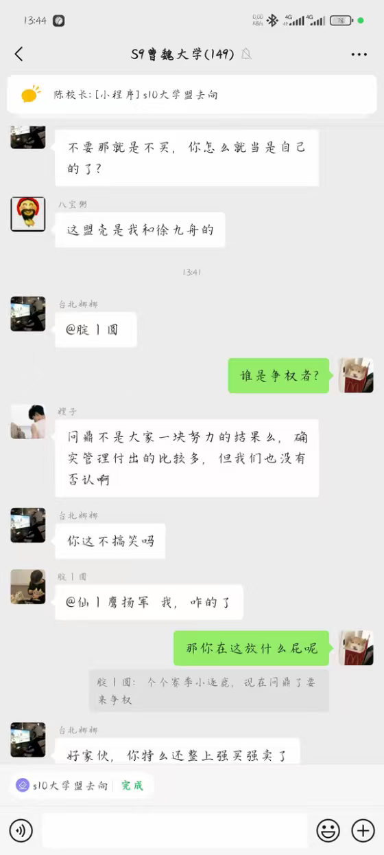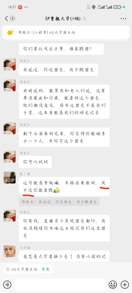 此事发生在W6-0074北军曹魏大学盟中。当时问鼎已定,曹魏大学问鼎,风云霸业,山河龙铸第三。这个盟从S1开始一直是几个老兄弟「ID为:徐九舟、长安姑娘、玄策上将,惊鸿境缘,润发,盛世,台北娜娜」互相换着当盟主玩,S9落地的盟主一直是老陈,在问鼎名额确定之前一直没什么问题,正常打。后来问鼎确定了,老陈也比较忙,就开始交由其他管理分管。主要人员有我「ID:仙丨鹰扬军,本赛季刚进的盟」、月定丨圆「ID:10413061082,上赛季进盟。主人公,记住ID以后要考」、老纪「与月定丨圆一起带人上赛季进盟」、洞明隐光、黑无搞与瓦莱西、秋丨轩宇、长安姑娘等共同管理。一开始共同管理没什么问题,但是就在老陈开始忙自己家事之后,月定丨圆开始渐渐对老陈有怨言。这事在我看来,毕竟是郊区,谁都有自己的家事,没必要按世界杯一样要求大家,谁有空谁管理就可以了。月定丨圆开始跟老陈要盟壳,还作势要买盟壳。图1:当时谁也没想到,这个小偷会有多么丑恶的嘴脸。