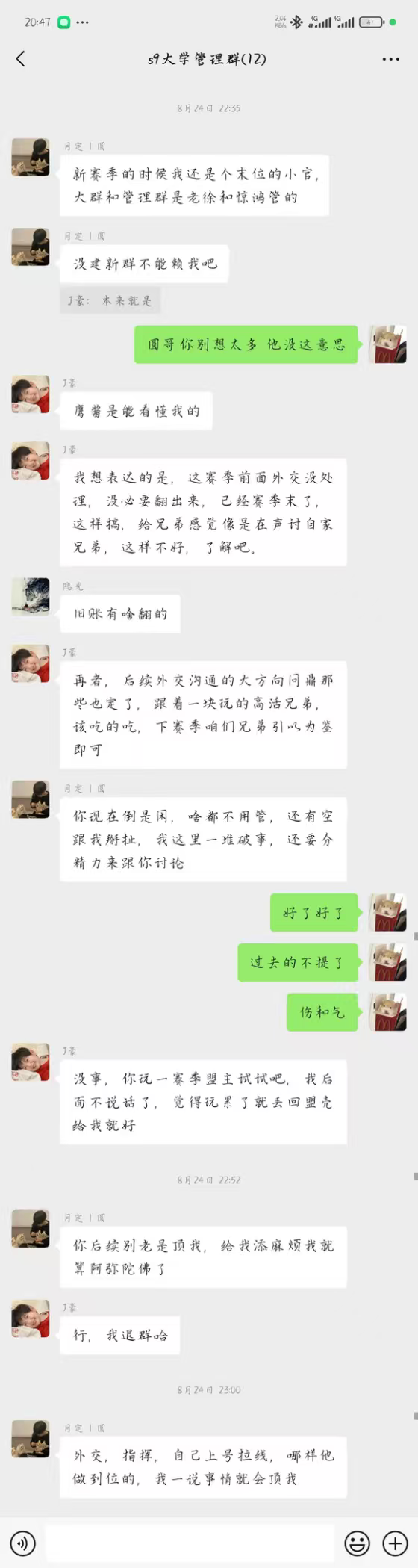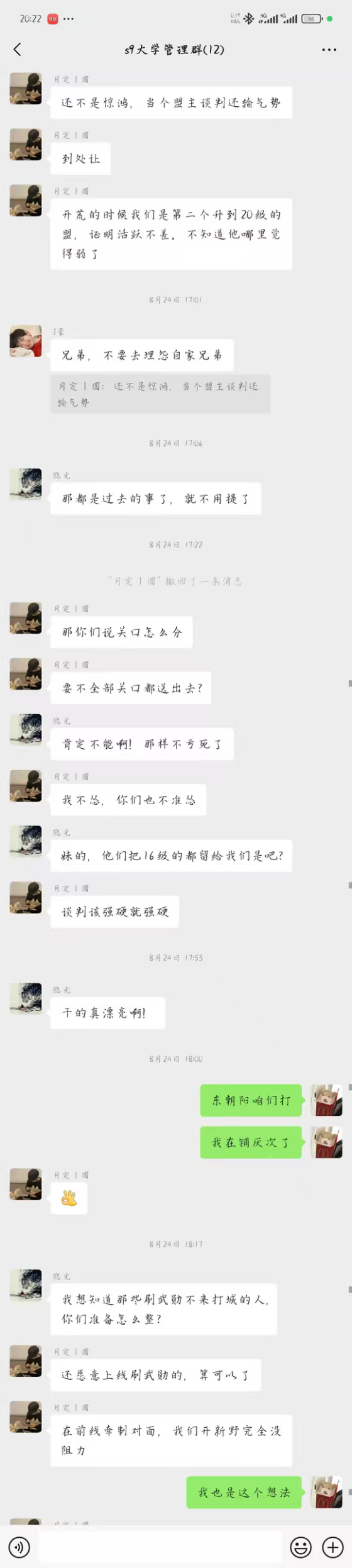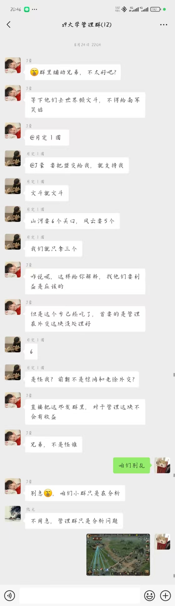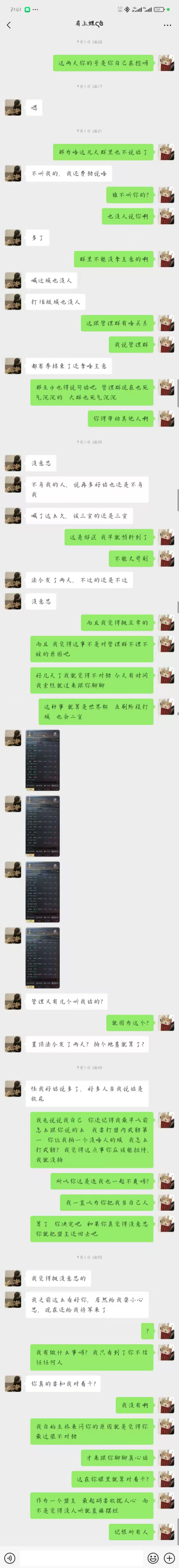 从把老陈逼退群之后管理群就是他的一言堂,第五张开始就是管理群里怎么问都不回的状态了。这件事的起因是月定丨圆发了个法令,让所有人迁城到叶县,当时南军的乾坤在那里没有人防守,当时已经基本处于互刷状态,很多人都没有去,少数人拍了地基,极少数人迁城过去了,当时我们管理好像都没有人迁城过去。就因为这些,他不再理任何管理,回任何话,真的很可笑。难道他当了盟主所有人都要无条件听他的,瞬间220人全部排满地基吗?先不说这是郊区,欧洲杯的互刷阶段也没有这种执行力吧?下一张:从他开始不再回管理群的任何消息之后,我就隐隐觉得气氛很怪,就算再忙也不会一句话的时间也没空说吧,我就去找他谈心了,在这个时候我还可笑的认为我应该是他的心腹吧?毕竟当上管理是他大力推荐的。
