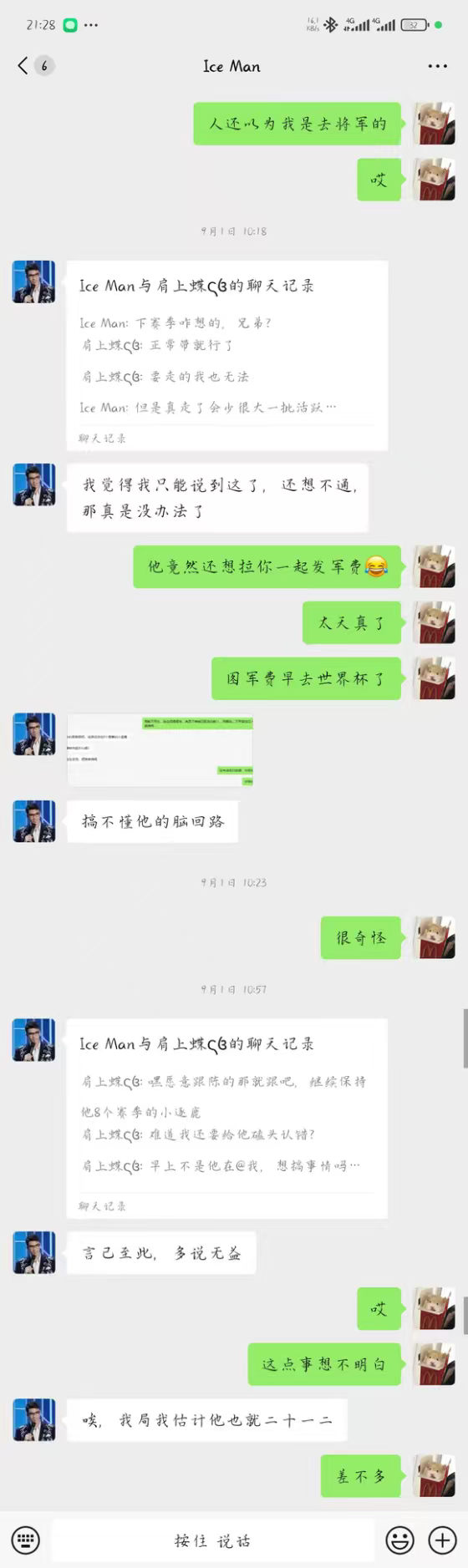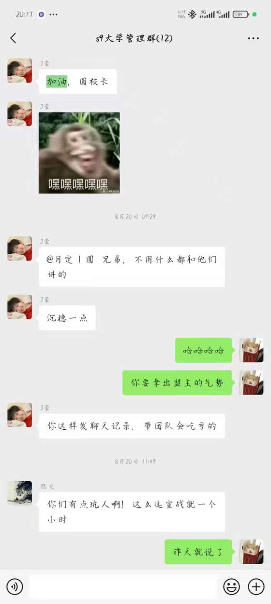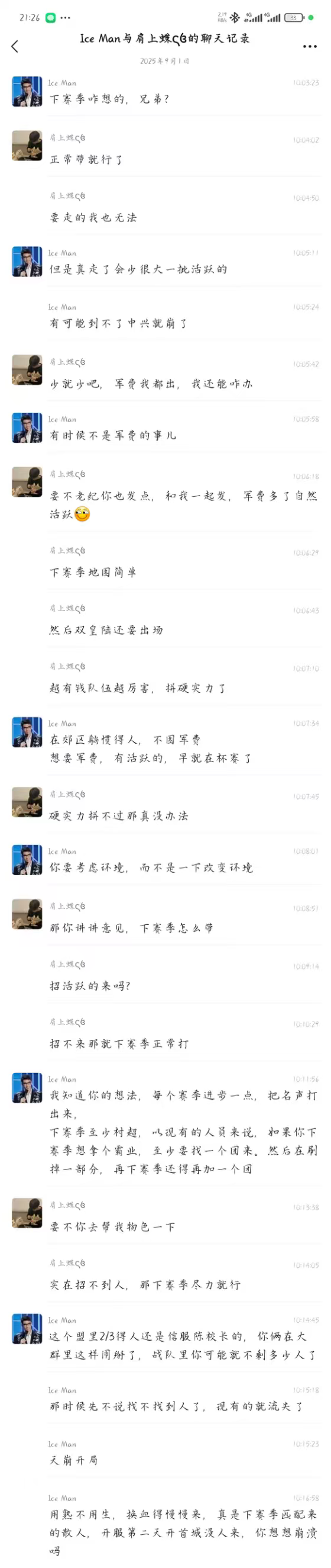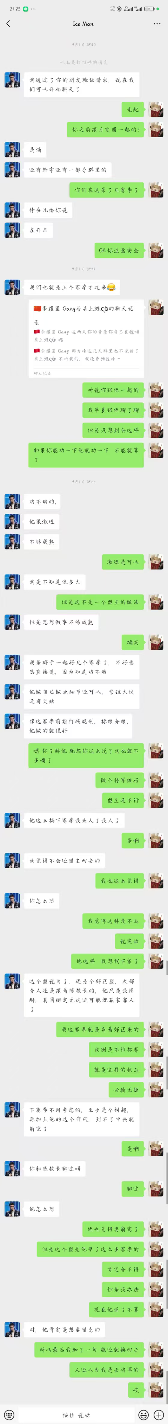 从把老陈逼退群之后管理群就是他的一言堂,第五张开始就是管理群里怎么问都不回的状态了。这件事的起因是月定丨圆发了个法令,让所有人迁城到叶县,当时南军的乾坤在那里没有人防守,当时已经基本处于互刷状态,很多人都没有去,少数人拍了地基,极少数人迁城过去了,当时我们管理好像都没有人迁城过去。就因为这些,他不再理任何管理,回任何话,真的很可笑。难道他当了盟主所有人都要无条件听他的,瞬间220人全部排满地基吗?先不说这是郊区,欧洲杯的互刷阶段也没有这种执行力吧?下一张:从他开始不再回管理群的任何消息之后,我就隐隐觉得气氛很怪,就算再忙也不会一句话的时间也没空说吧,我就去找他谈心了,在这个时候我还可笑的认为我应该是他的心腹吧?毕竟当上管理是他大力推荐的。