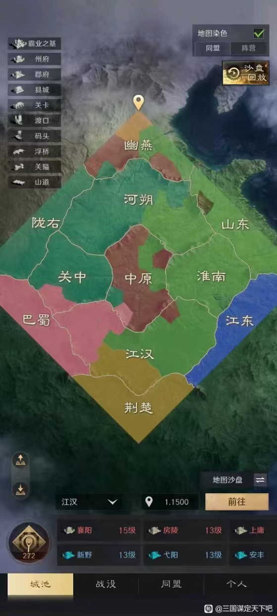 最终结果是:既然他不还盟壳,经过所有管理商量,全部退出曹魏大学,进入排行第二的盟风云,让风云问鼎!既然能让曹魏大学问鼎,也可以拆掉这个盟壳当时的局势是:现在的势力分布。暗红色是曹魏大学,幽燕的黄色是郊区大学,投稿者的分盟壳,绿色风云,青色山河。到现在已经完成了,风云问鼎,山河霸业,郊区大学大逐鹿,小偷小逐鹿。