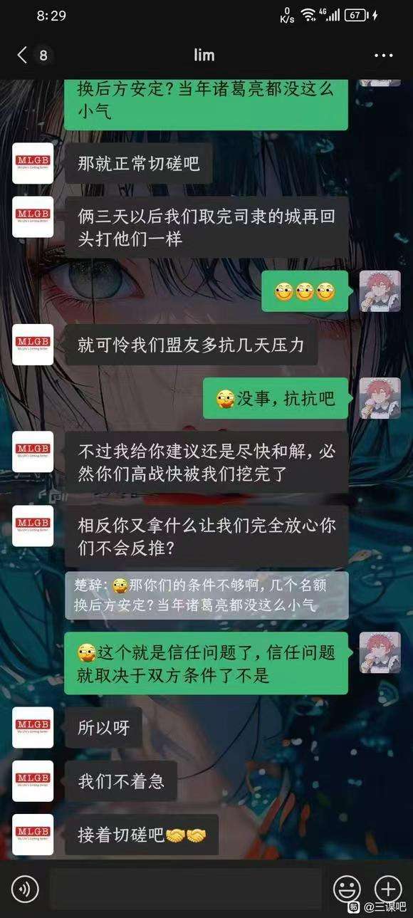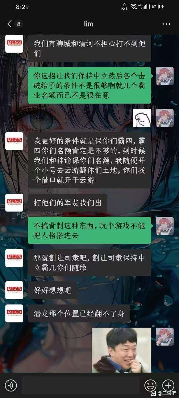 1、先捋一下关系:我是龍丨清风,隶属潜龙!图上绝丨苏苏为联盟绝云间指挥!图上横空丨收人为敌对盟横空出世管理!图上红色头发头像那哥们是联盟绝云间外交!二、绝云间作为盟友,在双方交战期间,指挥跟管理跟敌对盟谈条件,要保持中立!小表情发的贼6,现在被潜龙打了,反咬潜龙背刺!真服了!厚颜无耻!每天世界节奏带的飞起!对于自己的行为疯狂洗白!三、今天我就曝光绝云间管理的丑恶嘴脸!望今后碰到这个盟得兄弟,多多警惕!